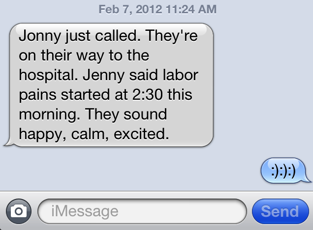 And finally, the most exciting anything of the week so far, I got a text early this afternoon that Jonny and Jenny were heading over to the hospital because of contractions!!