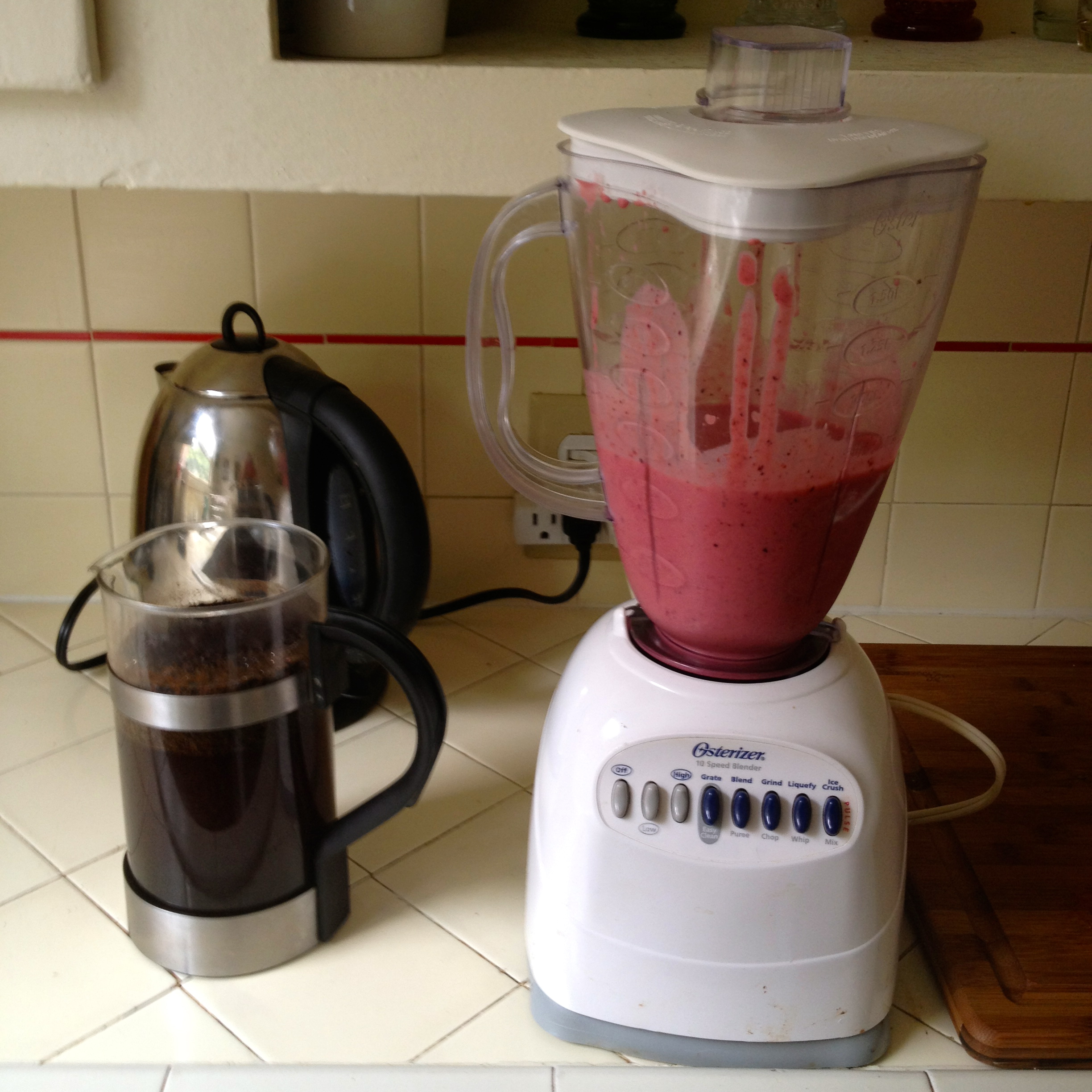 He has his French press of coffee, a couple of eggs, and a little bit of my smoothie now every morning before he goes in to work.