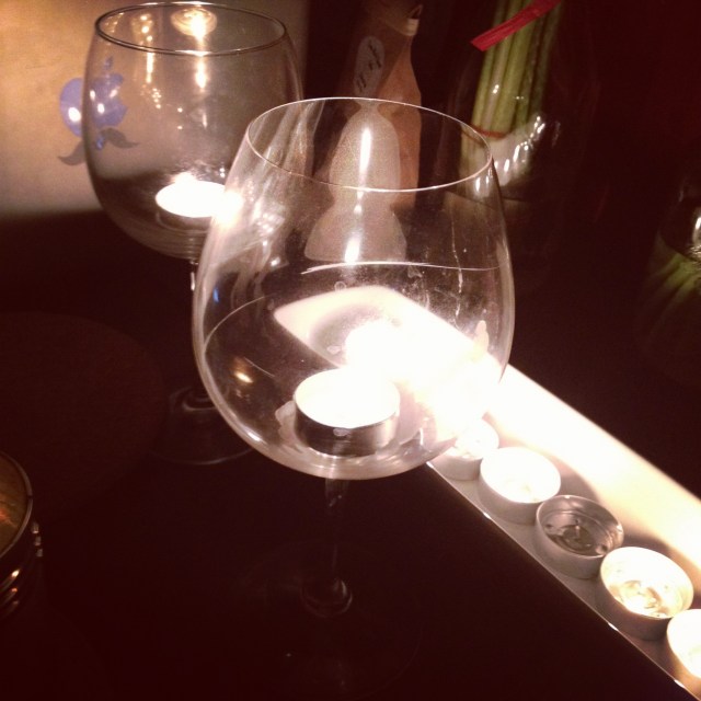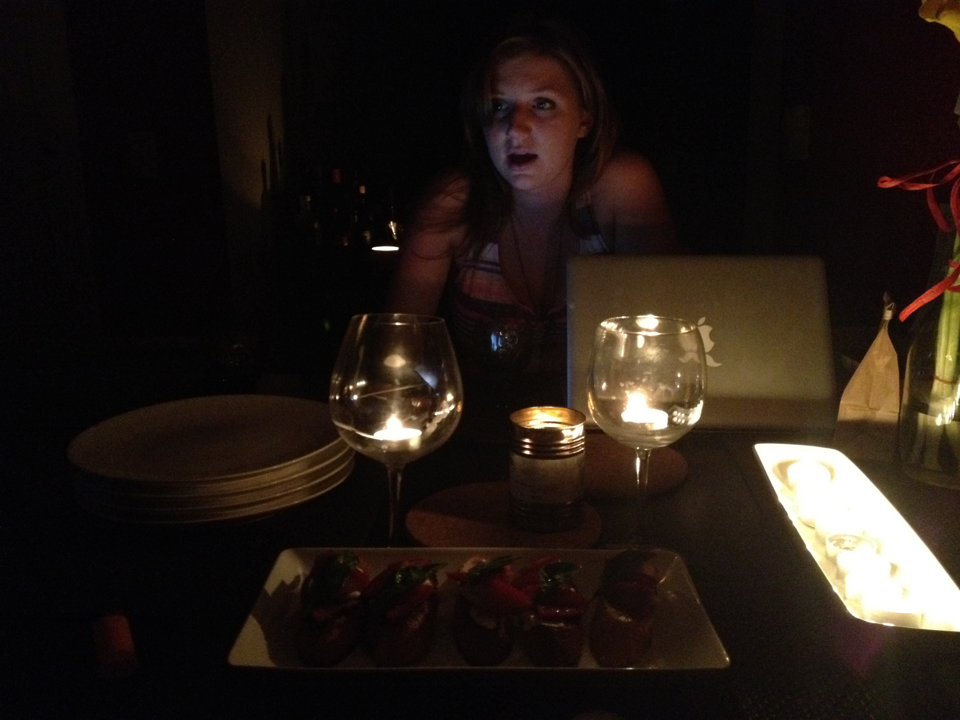I felt like Brad was on Kitchen Impossible, cooking a five course meal and plating it all in the dark. The leftover tea lights from our wedding that I never thought we’d use came in handy, scattered around the apartment in wine glasses, juice cups, and on plates.