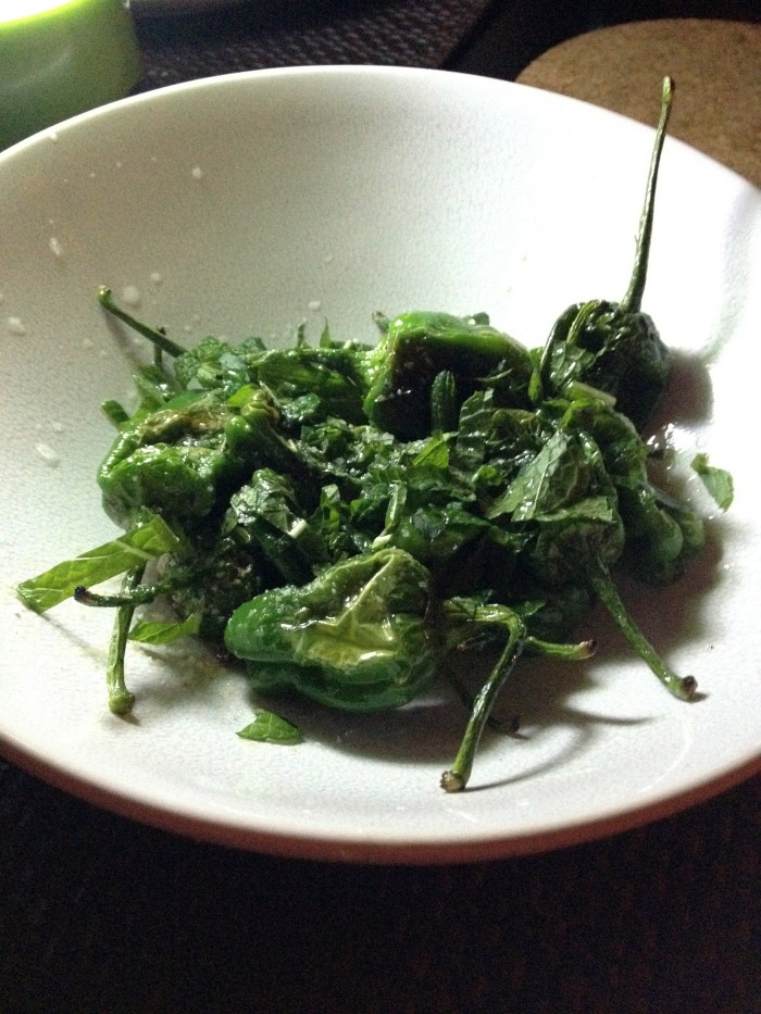 We ate our first course by candlelight. The roasted peppers were either super fiery or nice and sweet. The strawberry crostinis were divine.
