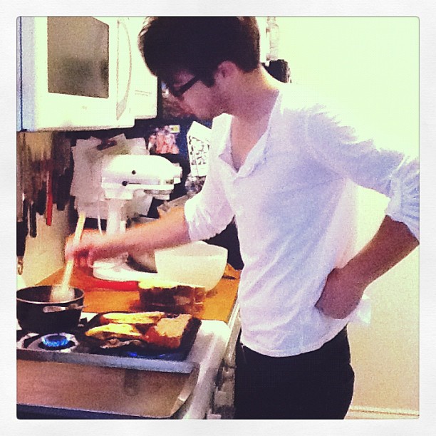 Usually I’ll roll out of bed as he leaves and get myself a bowl of yogurt. Sometimes I’ll feel fancy and make oatmeal with walnuts and raisins. Even less often I’ll go wild and make bacon grits or a fried egg sandwich.